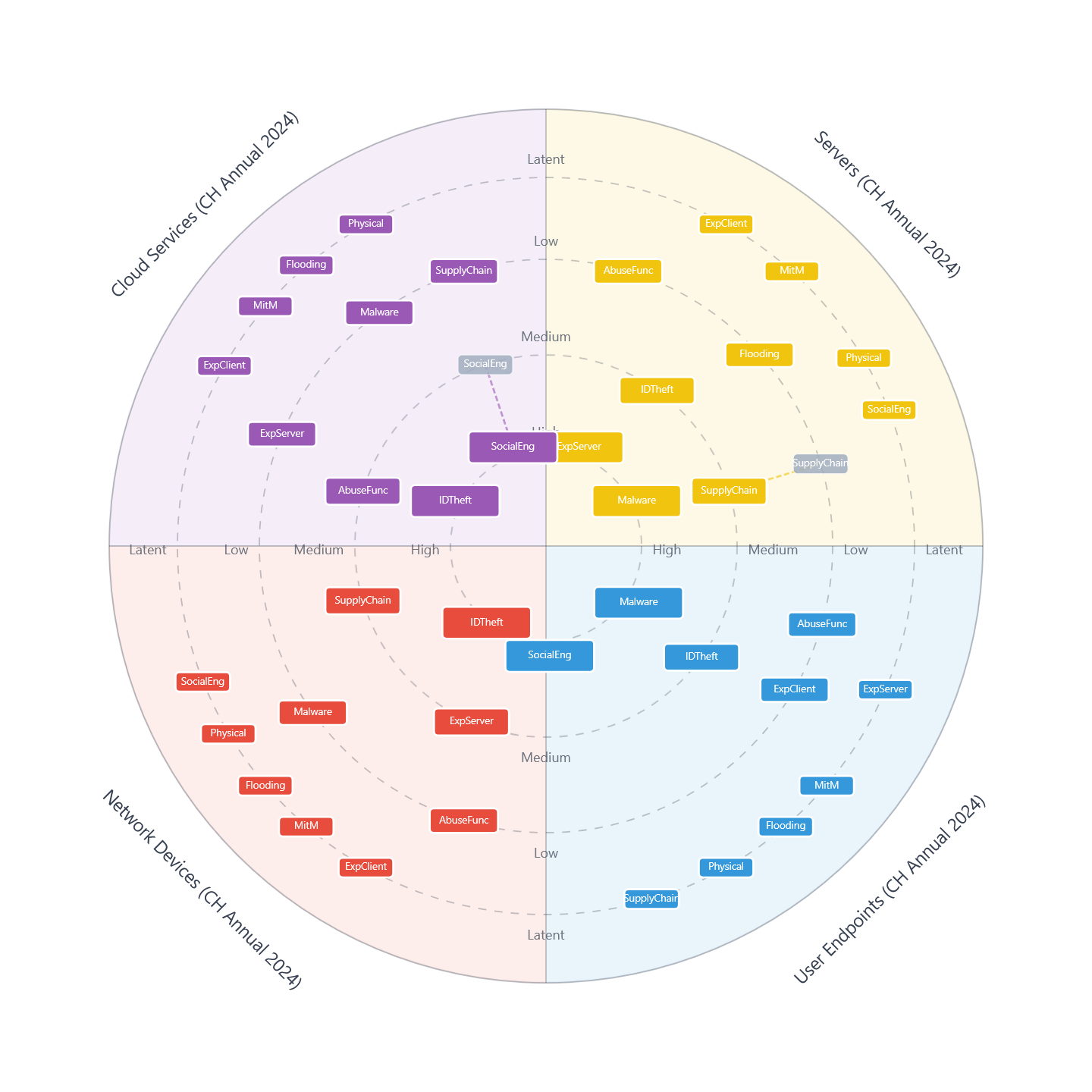 - Servers & Cloud: High intensity in #2 Exploiting Server (code implementation flaws) and #1 Abuse of Functions (misconfiguration/logic abuse).