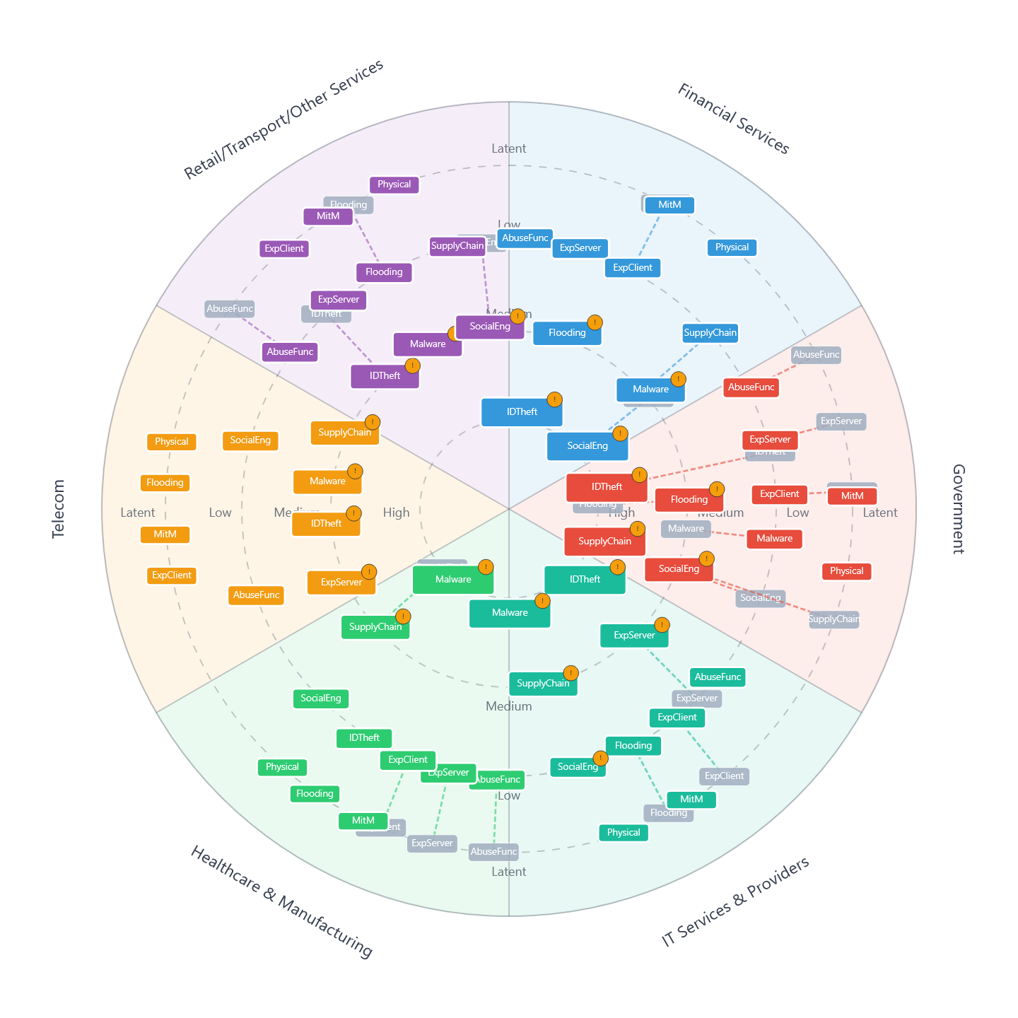 - IT Services & Providers (Green): The critical risk is #10 Supply Chain Attack. IT providers are the supply chain. Attackers compromise them to leverage the trusted relationship to deploy #7 Malware to downstream clients.
